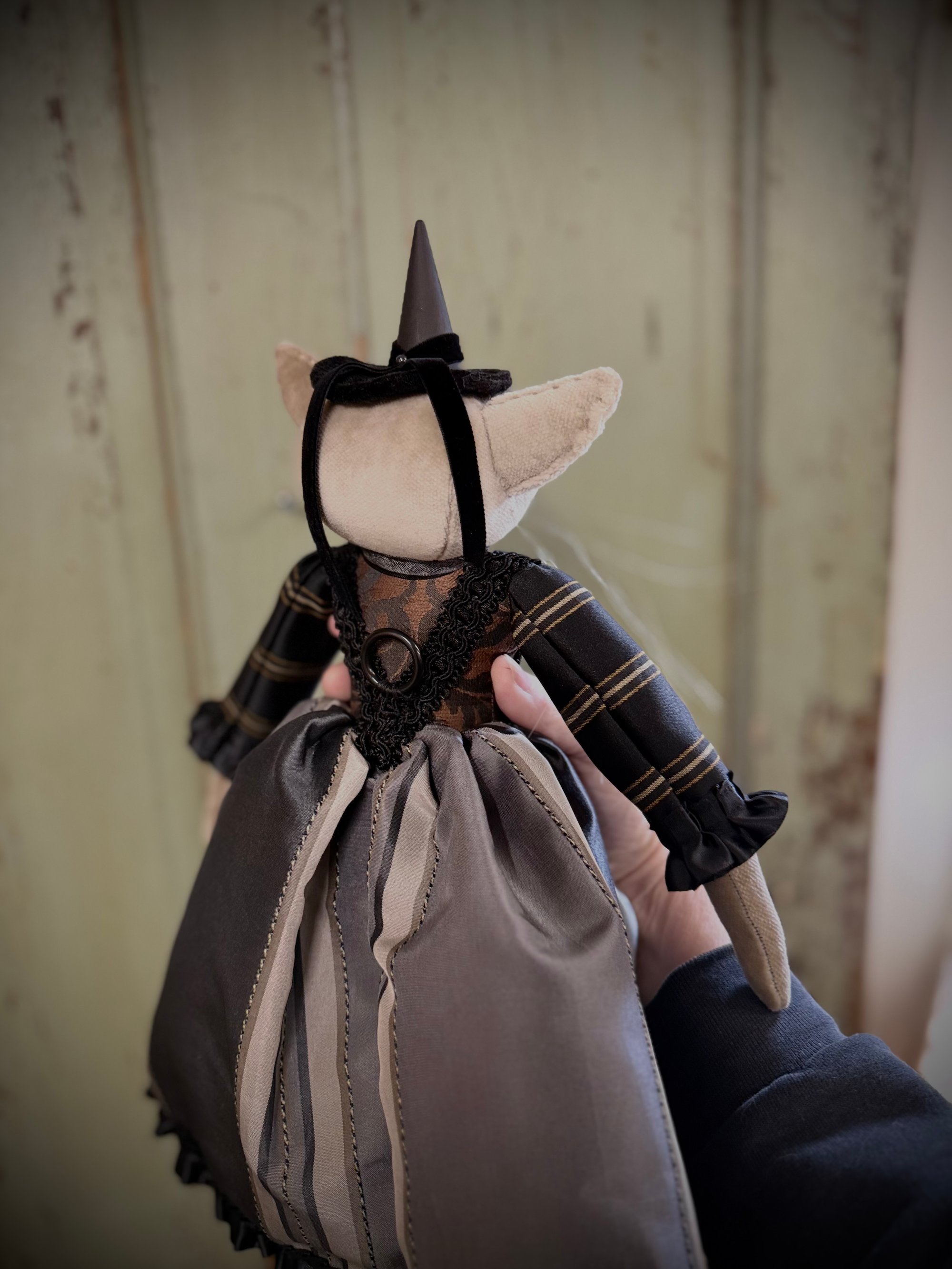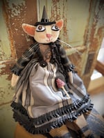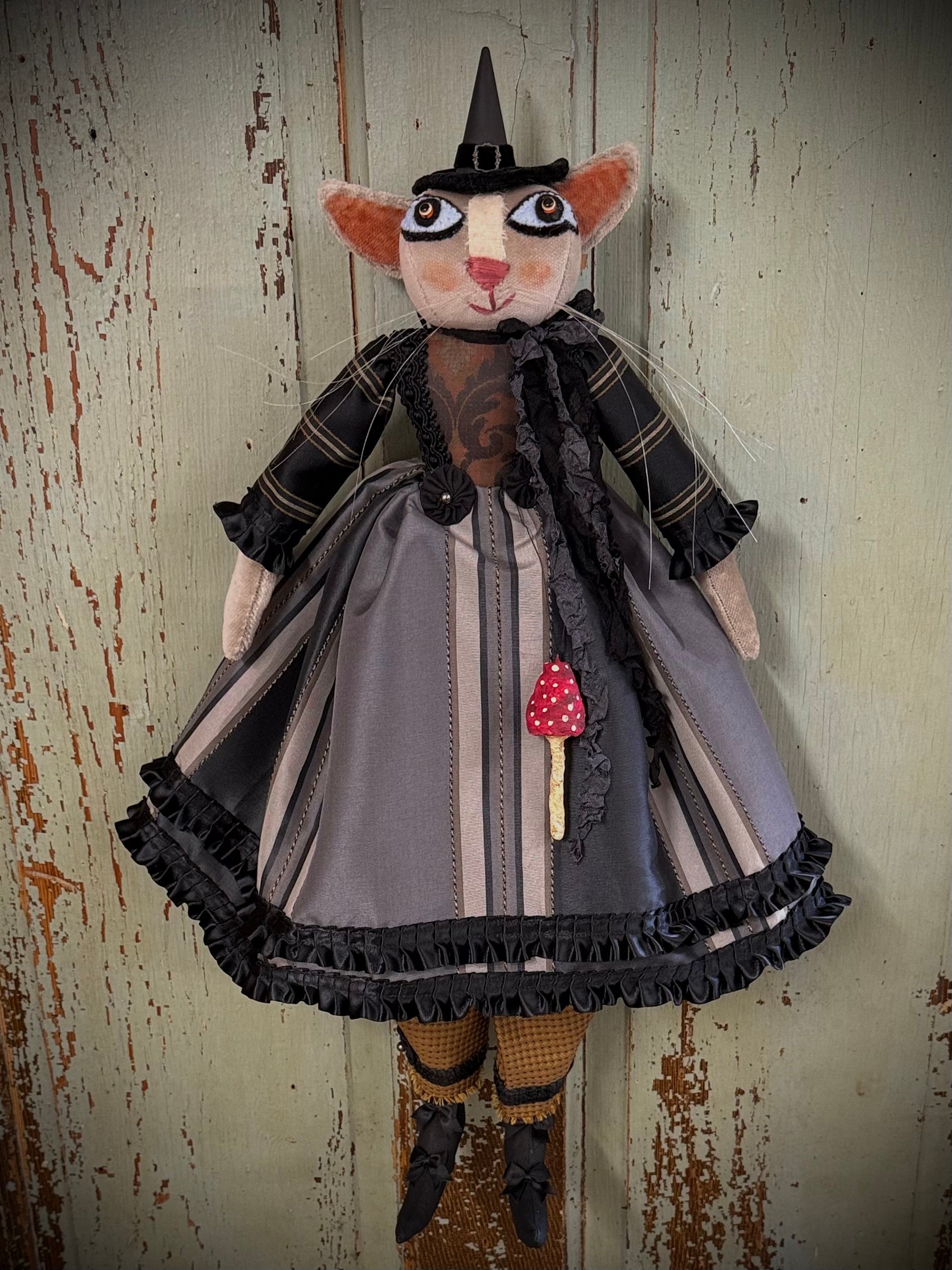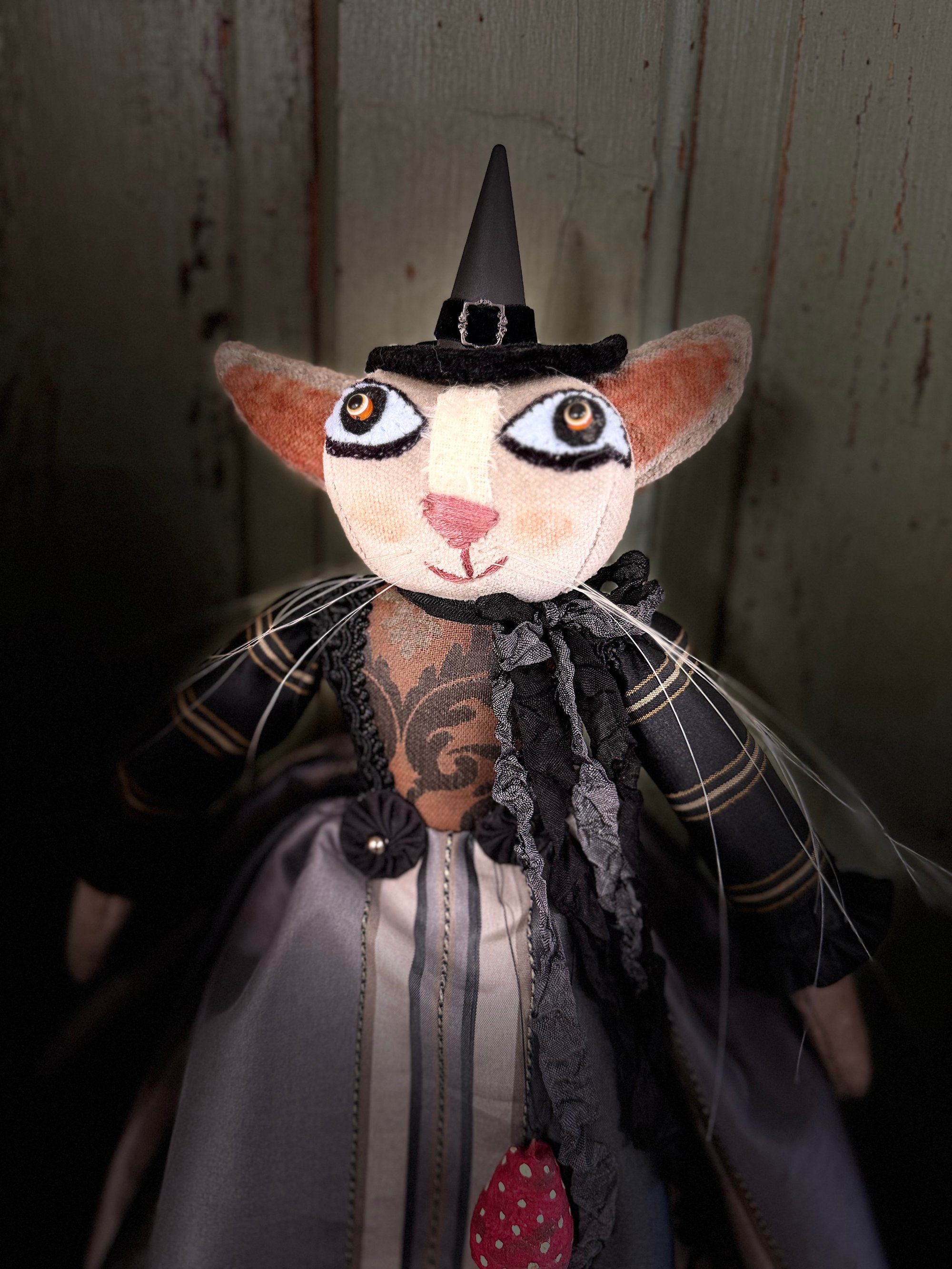 Blue Eyed Sweet Kitty Witch is handmade with both hand and machine stitching. She is wearing a beautifully detailed dress and pantaloons that are made from vintage fabrics and trims- she is loaded with texture and details. Her dress front is adorned with a handmade spun cotton mushroom that is removable - I loved the process of making it. Her hat is both cloth and wood.